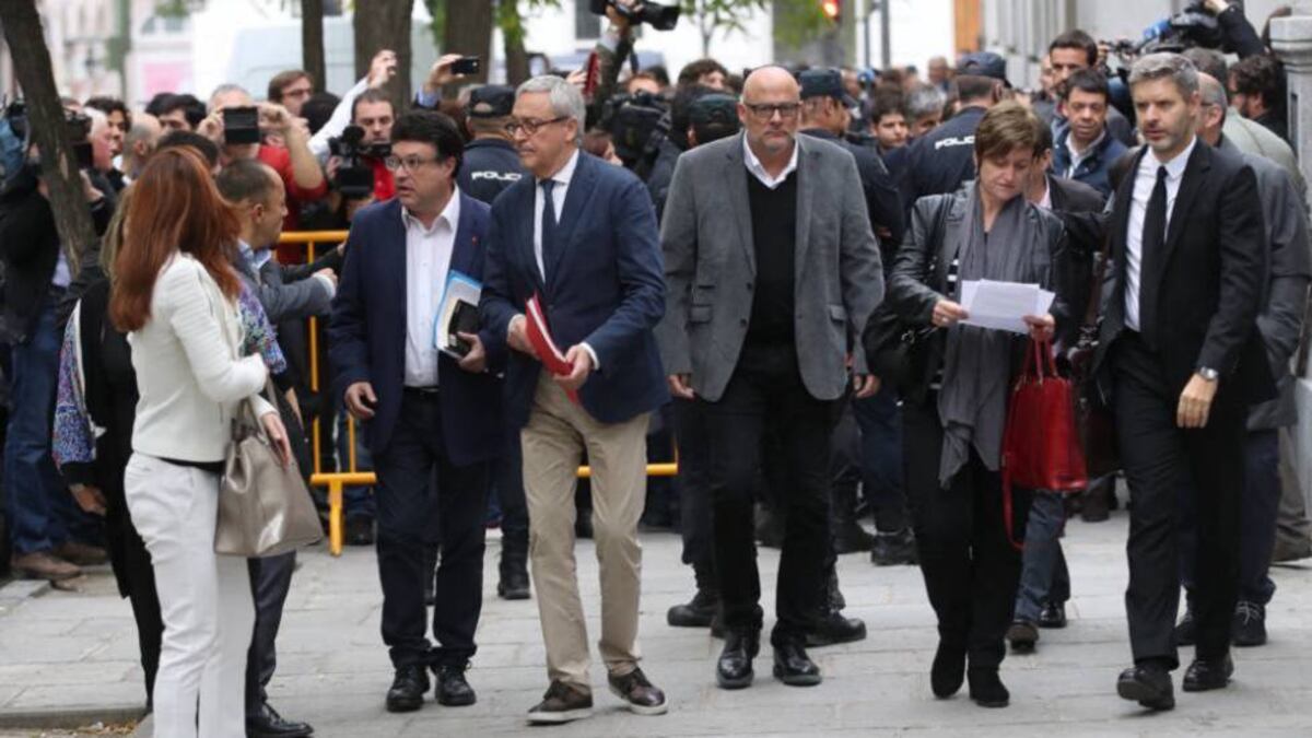 Los investigados por el Supremo han llegado a la sede del alto tribunal a las 9.15. Han entrado juntos con la excepción de Forcadell, que ha llegado en coche unos minutos más tarde acompañada por su abogado, Andreu Van den Eynde. El letrado de la presidenta en funciones del Parlament defiende también al exvicepresidente de la Generalitat, Oriol Junqueras, y a algunos de los exconsellers también citados por la juez Carmen Lamela, por lo que se ha quejado de la premura de las citaciones (fueron notificadas este miércoles) y de que coincidan en hora las comparecencias en los dos órganos, lo que, asegura, vulnera el derecho de defensa de los investigados.