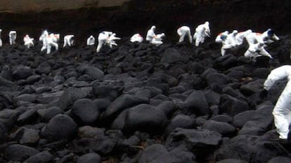 Vista de la playa Coído do Cuño, en la localidad de Muxía (A Coruña), el 18 de enero de 2003. Más de un centenar de voluntarios trabajan, vestidos en su mayoría con monos de trabajo blancos, en la limpieza del fuel vertido por el petrolero ‘Prestige’. Ahora, 15 años después, la zona completamente limpia. Fotos: EFE / Miguel Riopa - Óscar Corral
