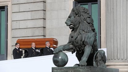 El féretro ha entrado en el Congreso a hombros de seis agentes de la Policía que están destinados en la comisaría de la Cámara. Le seguían la viuda de Marín y Ana Pastor. Con la de Marín, el Congreso ha acogido cuatro capillas ardientes. Le precedieron las de los expresidentes Adolfo Suárez y Leopoldo Calvo-Sotelo y el ponente de la Constitución Gabriel Cisneros. Poco después de su fallecimiento este lunes y a través de su cuenta oficial de Twitter, la Cámara destacó a Marín como "una figura esencial en la política española y europea.