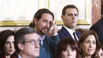 La gente que curioseaba en torno al Congreso, ante la profusión de coches oficiales y gente trajeada, hablaba mal de los políticos en general, con cierto escepticismo y bromas en voz alta. Era el pueblo de siempre en el burladero. Más allá, colas para entrar en Tarzán el musical y el bullicio prenavideño de la Puerta del Sol. Los ciudadanos podían tomarse el día libre, pero entre los políticos se notaba que en el Congreso había que estar. En protocolo confiaban: “Nueve de 16 presidentes autonómicos, esto no lo hemos visto nunca”. Venían tres o cuatro como mucho, no por desdén, sino porque la lealtad se les supone y para qué vas a coger un avión a Madrid pudiendo cogerte un puente. También había parlamentarios de partidos pequeños, que otras veces se ausentaban porque de todos modos no les iban a poner falta. O Pablo Iglesias, que el año pasado no vino. Todos hacían más bulto, como que esta vez no se podía escurrir. No era un día de la Constitución como los demás.