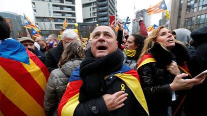 El independentismo eleva el tono para desacreditar internacionalmente la democracia en España. Según la policía belga, 45.000 manifestantes respondieron este jueves en Bruselas a la llamada de las organizaciones nacionalistas Òmnium Cultural y Asamblea Nacional Catalana. La marcha, que salió a las 11.30 de la mañana del barrio europeo de la capital belga, culminó con un acto político en el que los exmiembros del Govern dividieron sus diatribas entre el Gobierno español y las instituciones comunitarias. La ambivalencia fue la tónica de su discurso: insistieron en que son un movimiento de paz mientras atacaron con beligerancia a los poderes del Estado acusándoles de represión y totalitarismo. "¡Sois unos franquistas!", lanzó fuera de sí el exconsejero de Sanidad Antoni Comín. "Tenéis miedo de que un juez belga diga la verdad. ¡Estáis aterrorizados!", dijo a voz en grito en un mensaje teledirigido a Madrid.