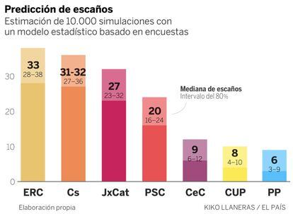 El modelo dice que ERC rondará los 33 escaños; le siguen Ciudadanos (31-32), JxCat (27), PSC (20), CeC-Podem (9), CUP (8) y PP (6). El gráfico también refleja la incertidumbre de estas elecciones. Las predicciones tienen horquillas de hasta 10 escaños, que pueden parecer excesivas, pero que no son caprichosas: vienen determinadas por el acierto histórico de miles de encuestas que hemos analizado.