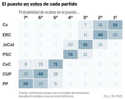 La tabla siguiente representa la probabilidad que tiene cada partido de quedar en cada puesto. Es evidente que no está decidido. De acuerdo con el modelo, Ciudadanos es la fuerza más votada en el 55% de las simulaciones y ERC en el 40%.