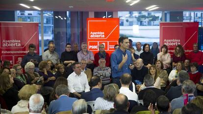 Sánchez ha expuesto su plan para el sistema de pensiones en el acto, enmarcado en su gira por diferentes ciudades españolas, con un formato de asamblea abierta a los militantes. Sánchez ha justificado el impuesto a la banca para paliar el déficit de la Seguridad Social, calculado en 15.000 millones para 2018. “Si la banca recibió un rescate de 77.000 millones de euros, ahora se le pide contribuir cuando tenemos el sistema de Seguridad Social en una situación casi de emergencia”. Sánchez aspira a recaudar 890 millones al año gracias a este nuevo impuesto.