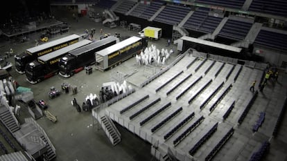 Alrededor de 200 personas forman parte del equipo de seguridad, vigilancia y acomodamiento del antiguo Palacio de los Deportes. “Es muy importante controlar que no nos pasamos del aforo permitido, y sobre todo, vigilar que nadie meta objetos peligrosos como petardos o bengalas en el interior”, subraya Ruiz. Son las 10 de la noche. Todo está a punto. 17.000 personas han acudido a la cita esperada. En unos minutos se cerraran las puertas del recinto que pretende ocupar los primeros puestos en la lista Pollstar en el futuro junto con el mítico O2 de Londres o el Madison Square Garden de Nueva York. La oscuridad reina en el hemiciclo. Un haz de luz azul se enciende sobre el escenario. Suena una guitarra. El concierto ha comenzado. Dentro de unas horas ese escenario que ahora baila con su público desaparecerá para dar vida a una cancha de baloncesto, una pista de hielo o una carpa de circo. Quién sabe.