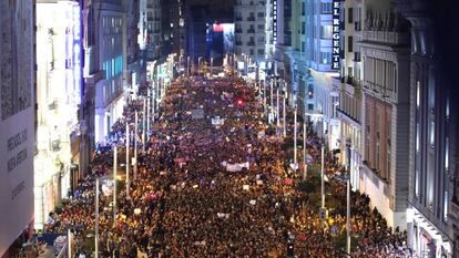“Aquí estamos las feministas” volvió a ser coreado con efervescencia ese día. La manifestación superó cualquier expectativa de las convocantes. Una de ellas, Julia Santos, estudiante de Sociología y Relaciones Internacionales en la Universidad Complutense de Madrid, recuerda que esperaban como mucho a 1.000 o 1.500 personas. “Fue totalmente improvisado, y no esperábamos multitudes. De repente, empezaron a llegar decenas de miles de mujeres. Nos pasó lo mismo que el 8M. Desbordó cualquier expectativa que pudiéramos tener, como si mucha gente estuviera esperando simplemente una oportunidad para salir a gritar su hartazgo”.