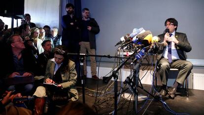 Carles Puigdemont ha pedido este sábado en Berlín que el Gobierno no interfiera en la investidura de Jordi Sànchez como candidato a president. En su primera conferencia de prensa tras ser puesto en libertad y ante un nutrido grupo de periodistas internacionales y españoles, Puigdemont ha revelado que fijará su residencia en Berlín mientras se resuelve su proceso de extradición. Tras descartar los jueces alemanes su entrega a España por el delito de rebelión, el expresidente ha anunciado que aprovechará su estancia en Berlín para ahondar en la internacionalización de conflicto.