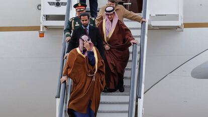 El príncipe heredero y hombre fuerte de Arabia Saudí, Mohamed Bin Salman, ha llegado este jueves a España en su primera visita oficial, al término de una gira que le ha llevado por Reino Unido, EE UU y Francia. Como gesto de deferencia y aunque no es jefe de Estado, el hijo del Rey saudí se hospeda en la Palacio de El Pardo mientras que su séquito, de unas 700 personas, llena un lujoso hotel de la capital.