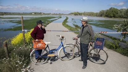 Jesús Aznar se ha venido de Zaragoza, donde trabaja como portero, a Boquiñeni, su pueblo, a comprobar por sí mismo la crecida del Ebro. En la televisión parecía anunciarse una catástrofe, pero aquí los vecinos tienen un sencillo método para medir el estrago que causará el agua en sus tierras. Como quien mide la altura de sus hijos cada año, en Boquiñeni, con unas líneas pintadas en la pared blanca de una torre, escriben su propia historia del río. Y, a pesar de las previsiones, la marca de la corriente de esta crecida coincide con la de 1980, pero está a más de un metro de la raya que marca la última gran riada de 2015, que anegó la cuenca del Ebro y obligó a todos los vecinos a salir corriendo en mitad de la madrugada.