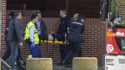 Sobre las 13.00, el presunto agresor se ha lanzado al vacío a la lona para huir de las llamas que él mismo supuestamente había provocado y que le estaban quemando. El agresor ha sido detenido al llegar al suelo y ha sido trasladado en ambulancia a un hospital. El presunto asesino permanece ingresado en el Hospital Santiago de Vitoria con pronóstico reservado, según ha informado el Servicio Vasco de Salud-Osakidetza.