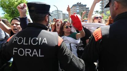 Se están viviendo momentos de tensión ante el cordón que ha formado la Policía Foral frente a la puerta del Palacio de Justicia. Los manifestantes gritan "esta justicia es una mierda", "no es abuso, es violación" o "si tocan a una nos tocan a todas". "Tendrían que haber sido condenados a 25 años por violación, que es lo único que se merecen", decía una de las mujeres allí presentes.