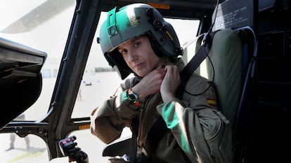 Embutida en su mono de piloto, parece una mujer menuda y frágil, pero rodeada de sus subordinados —varios de los cuales le sacan algún palmo—, o a los mandos de un helicóptero de nueve toneladas, se agiganta.