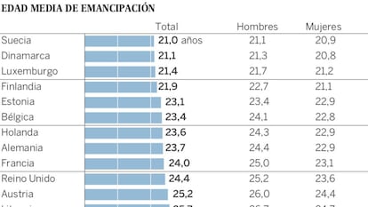 Los países donde los jóvenes se emancipan recién entrados en la veintena son Suecia, Dinamarca, Luxemburgo y Finlandia. Los jóvenes de Estonia, Bélgica, Holanda, Alemania, Francia y Reino Unido no han cumplido tampoco los 25 cuando ya se han independizado.