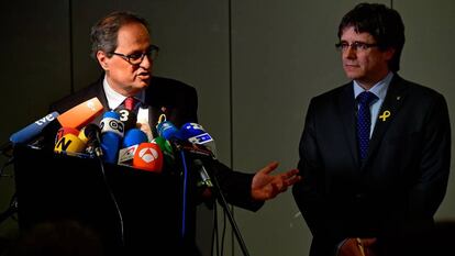 “Todos los consellers cesados por el 155 que quieran volver tienen todo el derecho”, ha defendido Torra. En ese sentido, el nuevo presidente ha explicado que “hemos empezado a hablar con los consejeros y decidiremos en las próximas horas”, indicó durante la comparecencia conjunta celebrada en español, catalán e inglés y en la que ambos líderes independentistas intervinieron indistintamente ante las preguntas de la prensa internacional. Siete exconsejeros están en prisión preventiva; otro en Bélgica a la espera de que la justicia belga se pronuncie sobre su extradición y dos retirados de la primera fila de la línea política.