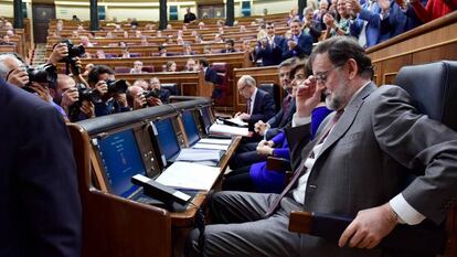 El PP lucha por su supervivencia. Esa es la sensación que se extiende por el partido ante la moción de censura que ha presentado Pedro Sánchez contra Mariano Rajoy, y que llega con la formación conservadora acosada por los casos de corrupción, las malas perspectivas de los sondeos y el auge de Ciudadanos. Perder el poder impediría al PP culminar la recuperación económica desde La Moncloa y le quitaría su gran argumento electoral. Al tiempo, el triunfo de la moción dejaría sin trabajo a cientos de cargos de confianza populares que trabajan para el Ejecutivo. Y, por encima de todo, la unión de la oposición convertiría a Rajoy en el primer presidente censurado de la democracia. En consecuencia, los populares afrontan la moción con pesimismo. “Vivimos estos días con dureza y tranquilidad”, se ha lamentado un veterano del PP con importantes responsabilidades en la batalla política con la oposición. “Es muy injusto, pero no hay que perder la calma”.