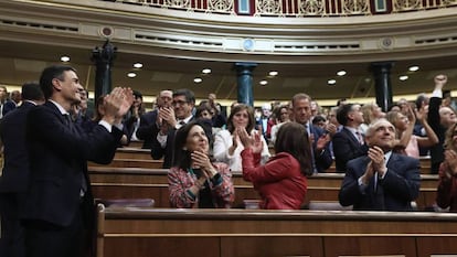 En la bancada de Unidos Podemos estaban encantados, casi más eufóricos que en el PSOE, y cantaban: “¡Sí se puede!”. Monedero alzaba el puño en la tribuna de invitados. Ada Colau aplaudía a rabiar. Sánchez se acercó a saludar a Iglesias, pero aquello se volvió también abrazo. Los de ERC se hacían fotos entre bromas en los primeros escaños. Los ministros que no son diputados y ya no iban a aparecer por allí se despedían de los bedeles. “Ministro, siempre a sus órdenes”, le decía una conserje a Juan Ignacio Zoido.