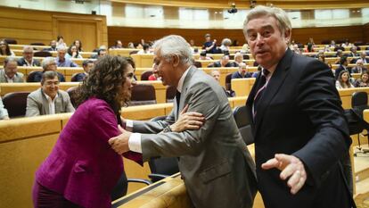 Pocas veces las sesiones parlamentarias en el Senado despiertan tanta expectación. Sobre todo cuando se debaten los Presupuestos. Suelen ser sesiones tediosas porque ya se han discutido en el Congreso y lo que se trata son pequeñas enmiendas técnicas. Pero la de este lunes era la primera intervención pública de un miembro del nuevo Gobierno de Pedro Sánchez en la Cámara Alta. La presencia de María Jesús Montero, la flamante ministra de Hacienda, tenía una importancia más simbólica y política que de otro tipo. Este lunes se debatían las cinco enmiendas a la totalidad que Unidos Podemos, ERC, PEdCAT, Compromís y Bildu —cinco de los grupos que apoyaron a Pedro Sánchez en la moción de censura que le llevó al poder— han presentado contra los Presupuestos de 2018, elaborados por el PP y defendidos por Rajoy en el Congreso.