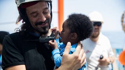 Varias decenas de varones han sido los primeros en abandonar el Aquarius para subirse a una lancha de la Guardia Costera italiana que les ha llevado hasta el barco de guerra en el que viajarán a Valencia. Dos de los marineros del barco humanitario les iban poniendo uno por uno chalecos salvavidas al lado de la escalerilla. Cada uno se llevaba la mochila con una manta que recibió al llegar. La hora previa ha sido un hormigueo en todas las cubiertas. A los maridos les han pedido que se reunieran con sus esposas —“solo los casados que tengan hijos, insistían”—, para asegurarse que en el proceso de repartir a los 629 en tres naves no quedaran familias separadas. “Amigo, busca a tus familia, a tus amigos y quédate con ellos”, les iba diciendo el altísimo Wademer Mischutin, un rescatador de SOS Mediterranée, alemán hijo de ruso. Muchos buscaban un bolígrafo con el que anotar un teléfono en un trozo de cartón. Para poder reencontrase en España algún día.