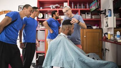 Desde la mesa puede verse el reflejo de la televisión emitiendo el telediario. Aparecen las imágenes de una barca y un montón de gente con un chaleco salvavidas naranja: “¡Es el Aquarius, mira!”. Pero no lo es. Son los últimos inmigrantes llegados a las costas de Andalucía de los que ellos no han oído hablar. Se empeñan en ser generosos. Un hombre con deficiencia pide dinero para comprar un yogur ante la indiferencia general. Ellos insisten en darle el euro que necesita. El día continúa en el supermercado donde compran cuchillas y crema hidratante para la piel quemada, en un comercio chino, de donde se llevan bolsas de viaje y una camiseta nueva, y, por fin, en una pequeña peluquería. Quieren la barba al cero y el pelo a lo marine americano. “No preguntes por qué, nos gusta así”, explica Yacine, minutos antes de ponerse a barrer el suelo para ayudar al barbero. El peluquero, José Linares, les regaló el servicio. Los argelinos agradecieron emocionados.