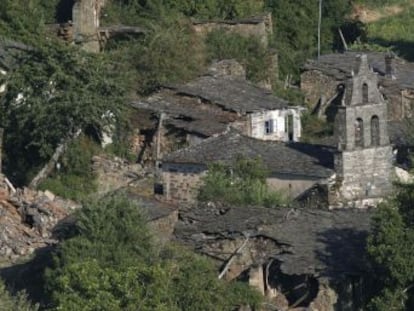 No hay calles, todos los edificios se disponen dando forma a una gran plaza en cuesta con la iglesia de Nuestra Señora de la Asunción presidiendo el conjunto. La única señal de vida humana reciente son las pintadas que alguien ha hecho en varias fachadas, también de la parroquia. Como el resto de casas, el interior del pequeño templo no conserva prácticamente nada en pie que recuerde a la capilla donde los vecinos escuchaban misa. En uno de los extremos hay, incluso, restos de paja, prueba de que ahí han sido guardados animales. “El pueblo está destrozado, aunque donde vivíamos nosotros se conserva un poco mejor. Han llegado a meter ovejas en la iglesia”, se lamenta Águeda, que vivió allí hasta los 22 años y lo visita siempre que puede.