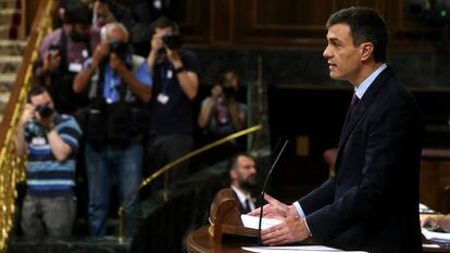 El nuevo presidente, Pedro Sánchez, quiso innovar y plantear por primera vez en el Congreso un debate previo para consensuar en parte una postura conjunta ante la reunión determinante este jueves y viernes en Bruselas del Consejo europeo. Anunció incluso que la UE quiere dar más dinero a España en su labor de puente de diálogo con los países emisores de migrantes. Pero la discusión no aportó novedades y reflejó el nuevo reparto de la cámara. El PSOE y sus socios de la moción de censura agradecieron, con matices y un cierto desmarque de ERC, el espíritu solidario del ejecutivo de Sánchez e incluso le pidieron un giro más progresista. PP y Ciudadanos se quedaron anclados en que Sánchez aún no ha explicado su proyecto general para España tras la moción.