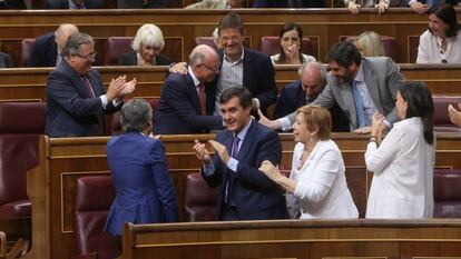 El Congreso ha validado el último trámite de los Presupuestos Generales del Estado de 2018, que el PP enmendó en el Senado después de que el PNV, que apoyó las cuentas del Gobierno de Mariano Rajoy, votara a favor de la moción de censura que llevó a Pedro Sánchez a la Moncloa. El pleno, sin embargo, ha evitado las pretensiones del PP de desviar 31 millones de las inversiones previstas en el País Vasco. La Cámara ha dado su respaldo al proyecto presupuestario, que asumió Sánchez pese a rechazarlo, y también a 32 de las 46 enmiendas del Senado, como la que aumenta las indemnizaciones a los afectados por el fármaco de la talidomida. Esta enmienda ha recibido el apoyo de todos los partidos excepto Foro Asturias y el PSOE, que ha argumentado que “no supone una solución real por carecer de dotación presupuestaria [por ser una disposición adicional]” y ha adquirido el compromiso de afrontar el problema desde el Gobierno.