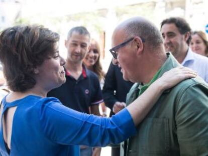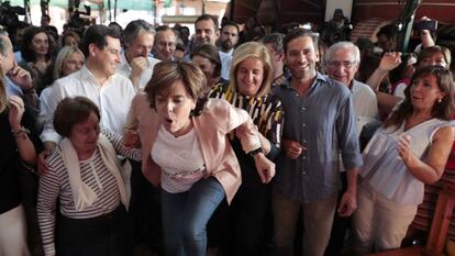 Mientras tanto, Sáenz de Santamaría cerraba su campaña en Vallecas. Muy sonriente y con un mensaje de unidad, la exvicepresidenta del Gobierno dijo: “He disfrutado mucho con esta campaña y estoy muy contenta con el trabajo que hemos hecho, siempre en positivo”. La candidata a liderar el PP hizo esperar unos veinte minutos a los militantes y cuando llegó en La Sorayeta, tal y como llaman los afiliados a la furgoneta en la que Sáenz de Santamaría ha hecho campaña, lo primero que hizo fue abrazarse a Eva Durán, exdiputada y presidenta del partido en el distrito de Vallecas, que fue la anfitriona del evento.