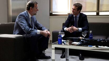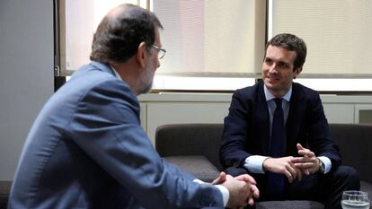 El presidente del PP, Pablo Casado, ha trasladado este lunes a su predecesor, Mariano Rajoy, sus planes como nuevo líder de la formación. Casado ha querido que su primera reunión de trabajo y la primera persona que entrara en su nuevo despacho fuera el expresidente del Gobierno, según fuentes del partido. En el encuentro, que ha durado 90 minutos, ha informado a Rajoy de su intención de integrar en su equipo a los perdedores de las primarias en el primer comité ejecutivo de la nueva era, que será el jueves y en Barcelona para lanzar un mensaje "inequívoco" de que pretenden dar la batalla en Cataluña después del descalabro de las últimas elecciones autonómicas —el PP no obtuvo los votos necesarios para formar grupo parlamentario—.