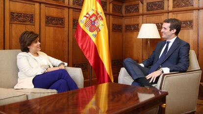 En su primera reunión después del congreso que eligió al sucesor de Mariano Rajoy, Pablo Casado (el ganador) y Soraya Sáenz de Santamaría (la derrotada) intercambiaron los papeles. Si en la campaña ella había insistido en que él debía integrarse en su candidatura por haber sido la más votada en la primera vuelta —la de los afiliados— este miércoles fue el nuevo líder del PP el que reivindicó su 57% de los votos de la segunda y definitiva —la de los compromisarios— para rechazar la reclamación de la exvicepresidenta de hacer un organigrama "proporcional" al resultado del congreso.