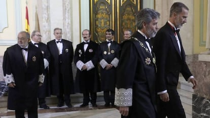 En los próximos meses, el Supremo juzgará en la causa abierta por rebelión y malversación de fondos a 18 líderes independentistas —hay otros siete fugados— por el proceso que desembocó en el referéndum ilegal de autodeterminación y en la declaración de independencia del pasado 27 de octubre. Lesmes, sin nombrarlos, les ha dirigido un severo reproche: "En ocasiones, la violencia o la astucia —cuando no la combinación de ambas— han permitido desbordar un determinado modelo orgánico de democracia constitucional sin seguir los procedimientos establecidos", ha dicho. La alusión a la "violencia" iba cargada de intención: es el requisito para poder aplicar el delito de rebelión, que pena con hasta 30 años de prisión, entre otros actos, los intentos de secesión de una comunidad autónoma al margen de las vías constitucionales.