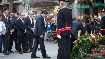 Carles Puigdemont encabezó como president la ofrenda floral del Govern al monumento de Rafael Casanova de la Diada de 2017. Le acompañaban el vicepresidente Oriol Junqueras y el resto de miembros de su Ejecutivo. Un año después, ninguno de ellos figuró en la foto oficial. Cinco, entre ellos el propio Puigdemont, están huidos de la justicia española; seis se encuentran en prisión preventiva; y los tres restantes (Carles Mundó, Santi Vila y Meritxell Borrás) han abandonado la política tras estar encarcelados.
