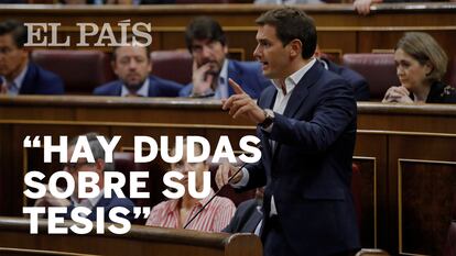 “Hay dudas razonables sobre su tesis doctoral, ¿por qué la oculta? Por el bien de la Universidad haga pública su tesis doctoral y no vete la ley que obligue a publicarlas”, soltó Rivera en la sesión de control. Sánchez estaba preparado para responder una pregunta sobre Cataluña, que es la que el líder de Ciudadanos había registrado. Pero Rivera la cambió sobre la marcha para sacar el asunto de la tesis. “Mi tesis está registrada y es pública de acuerdo con la legislación vigente”, respondió Sánchez lanzando el dedo índice hacia Rivera con una dureza en el gesto pocas veces vista en el presidente. “Infórmese, usted viene al Congreso sin prepararse”, le reprochó, mientras la bancada de Ciudadanos negaba.