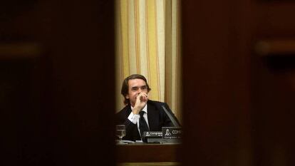 Apenas tres meses después de que la sentencia del juicio principal de Gürtel propiciara la moción de censura que acabó con la carrera política de Mariano Rajoy, José María Aznar acudió este martes al Congreso para comparecer en la comisión de investigación por la financiación ilegal del PP, el partido que él presidió durante 14 años. Los apuntes de los papeles de Luis Bárcenas, extesorero de la formación, arrancan en 1990, cuando Aznar se pone al frente de las siglas. El caso Gürtel estalló en 2009, cinco años después de que abandonara la presidencia del partido.