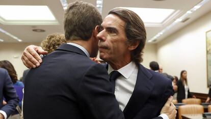 “Tengo la sensación de que mi partido me quiere mucho”, aseguró José María Aznar en la comisión de investigación sobre la presunta financiación ilegal del PP, inaugurada con un abrazo de Pablo Casado al expresidente delante de las cámaras. La nueva cúpula popular se esfuerza por quitar hierro a la rehabilitación del hombre que renunció a ser presidente de honor del partido para que todos oyeran su portazo. En público, insisten en que están “muy orgullosos” de su pasado, incluyendo en la misma frase los nombres de todos los presidentes de la formación. En privado, admiten la trascendencia del cambio en la relación con su antiguo líder y, según se trate de partidarios o detractores de Aznar, es decir, de leales o contrarios a Mariano Rajoy, aventuran consecuencias diferentes.