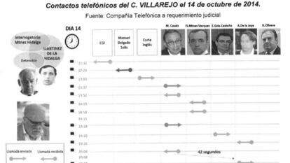 La tarde de la detención, el comisario tiene un tráfico de llamadas que meses después despertará las sospechas de los investigadores. Además de sus conversaciones con el número dos del Ministerio del Interior (véase ilustración que acompaña esta página), Villarejo habla con su amigo Adrián de la Joya, un empresario al que se ha involucrado como testaferro de políticos en casos de corrupción de la Comunidad de Madrid. Asuntos Internos también sitúa a De la Joya en la operación inmobiliaria sospechosa sobre una finca vinculada a los movimientos del Pequeño Nicolás. La policía destaca además los contactos de Villarejo con Mauricio Casals, presidente del diario La Razón y que, según los investigadores, está muy vinculado a De la Joya y al propio comisario. Tras analizar las llamadas, los investigadores de Asuntos Internos llegaron a la conclusión de que Villarejo maniobró para intentar que se anulase la investigación y de esa manera evitar que su amigo De la Joya se viera implicado en el asunto.