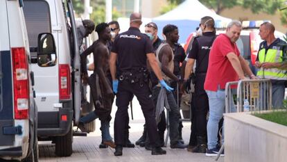 Los 223 inmigrantes fueron trasladados en un primer momento al CETI. Allí, se efectuaron las primeras filiaciones, antes de ser trasladados a la comisaría de la Policía Nacional. Los migrantes bajaron de los furgones en pareja. Algunos, con las manos atadas por bridas. Entre 10 y 15 podrían ser menores, según fuentes policiales. Más tarde, fueron devueltos al CETI, donde una abogada de oficio les ofrecía asistencia.