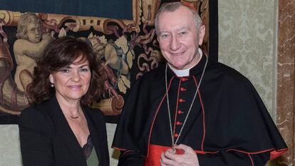 La decisión del Gobierno de impedir que los restos del dictador Francisco Franco acaben en la catedral de La Almudena ha provocado una tensión inesperada con el Vaticano. La vicepresidenta, Carmen Calvo, anunció en el Congreso que el Ejecutivo usará la ley de memoria histórica para impedir el deseo de la familia Franco de que el dictador sea enterrado en La Almudena cuando salga del Valle de los Caídos, y aseguró que el secretario de Estado del Vaticano, Pietro Parolin, con el que se reunió el lunes, estaba de acuerdo en buscar una alternativa. "El cardenal entendió que debíamos buscar una salida para que los restos de Franco estén en un lugar con dignidad pero que no puedan ser objeto de homenaje de ningún tipo. Acordamos [con el Vaticano] trabajar de manera conjunta para encontrar una salida que obviamente no puede ser La Almudena", sentenció Calvo.
