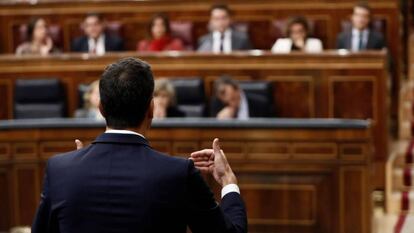 La sesión de este miércoles ha sido una prolongación de la de la semana pasada, ya que el líder del PP ha querido entrar al trapo sobre el anuncio de ruptura de relaciones que la semana pasada invocó Sánchez por haberle hecho copartícipe “del golpe en Cataluña”. Casado le ha devuelto el argumento: ha pedido al jefe de Gobierno que rompa con “los golpistas” y ha continuado con una cadena de descalificaciones. “A usted el cargo le queda grande; usted ha roto con quienes ganaron las elecciones, así que deje el victimismo hipócrita porque no hace nada contra quienes han convertido las escuelas en Cataluña en madrasas [escuelas coránicas], pero usted no tiene escrúpulos, y se apoyará en ellos para seguir en el Gobierno”.