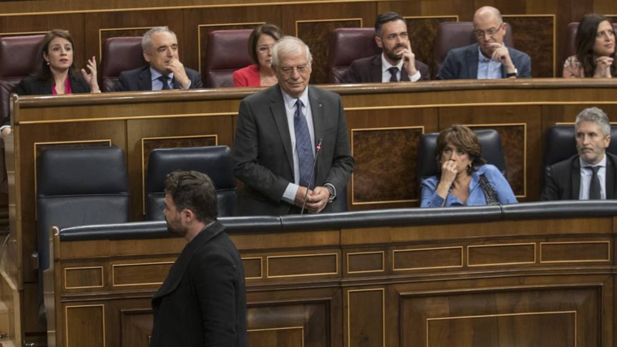 Gabriel Rufián utilizó su pregunta para atacar con dureza a Borrell, al que descalificó como "una vergüenza" por sus consideraciones en el pasado sobre antiguos miembros del Gobierno de la Generalitat de Cataluña ahora en la cárcel, como el exvicepresidente Oriol Junqueras o el exconsejero de Exteriores Raül Romeva. Fue en ese momento cuando el ministro de Exteriores lamentó que Rufián no debatiera sobre asuntos sólidos, sino que vertiera "serrín y estiércol". "Es lo único que usted es capaz de verter", dijo Borrell con una mayoría de los diputados del PSOE levantados de sus asientos para aplaudir su intervención.