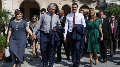 La sorpresa, sin embargo, ha venido cuando Díaz-Canel y su esposa, Lis Cuesta, han acompañado al matrimonio formado por Sánchez y Begoña Gómez en un paseo de una media hora a pie por La Habana Vieja, guiados por las explicaciones de Eusebio Leal, responsable de la rehabilitación del casco histórico de la ciudad. Al contrario de lo que sucedió en 1999, cuando Fidel Castro cerró las calles por las que paseaban el rey Juan Carlos y José María Aznar para evitar que los cubanos pudieran acercarse a ellos, esta vez las dos parejas, rodeadas por un férreo cordón de seguridad, han podido corresponder a cientos de vevinos y turistas que se agolpaban para saludarles, aunque la inesperada presencia en la calle del mandatario cubano acaparaba más interés que la de sus huéspedes españoles.