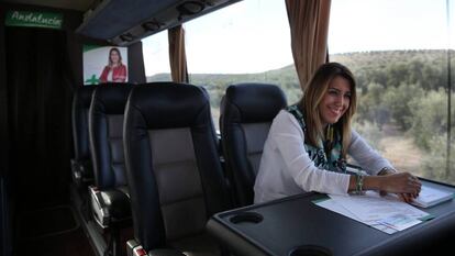 Susana Díaz, la candidata socialista a la reelección como presidenta de la Junta de Andalucía, encara la semana final antes de la cita con las urnas exactamente igual que la inició: con ilusión. El contacto con la gente de la calle de estos primeros 12 días de caravana le ha transmitido buenas sensaciones de cara al 2 de diciembre, pese al boicot violento protagonizado por un centenar de taxistas que obligó a suspender un acto en las inmediaciones de Sevilla. A lo largo de esta última semana larga, la dirigente del PSOE ha soslayado la política nacional y ha centrado su discurso en alertar contra un posible bloqueo que le impida formar gobierno en enero. Díaz solo tiene un plan A: gobernar en solitario, sabedora de que la fragmentación parlamentaria que alumbren las urnas el próximo domingo la va a abocar a una legislatura difícil donde tendrá que pactarlo casi todo.