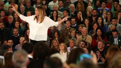 La candidata socialista, por su parte, ha tratado de soslayar todo lo posible la política nacional en su campaña y eso explica la escasa presencia de dirigentes del partido, incluido el presidente. El eje de la primera semana fue alejar el fantasma de un posible bloqueo del PP y Ciudadanos en el Parlamento para lo que llamó a la movilización de su electorado. Díaz dio un giro a su estrategia la última semana, cuando decidió ligar a Vox con ambas formaciones para presentar al PSOE como el único partido capaz de “frenar a las derechas”. Hasta entonces, solo Sánchez, en el primer mitin conjunto con Díaz en Chiclana (Cádiz), había aludido expresamente a la extrema derecha para, también en clave nacional, responsabilizar a Casado de su auge. Ahora ambos líderes han abrazado ese discurso, hasta el punto de que la propia presidenta de la Junta lo ha vinculado al resultado del PSOE en las generales. “Andalucía tiene que ser el dique de contención de la derecha para que, cuando las elecciones generales toquen, volvamos a ganar en nuestro país”, aseguró el jueves en un acto de UGT.