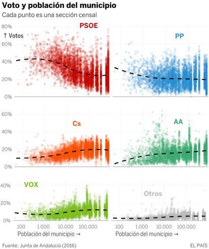 Las elecciones andaluzas han supuesto un vuelco político: PP y PSOE han obtenido los peores resultados de su historia, mientras crecía Ciudadanos y emergía un partido nuevo en la extrema derecha. Hemos analizado los resultados en todas las secciones censales (que se corresponden con vecindarios de unas 1.450 personas) a la vez que consideramos estadísticas como la edad de los votantes, su nivel de estudios o su origen. Estos son los patrones más claros que hemos encontrado.