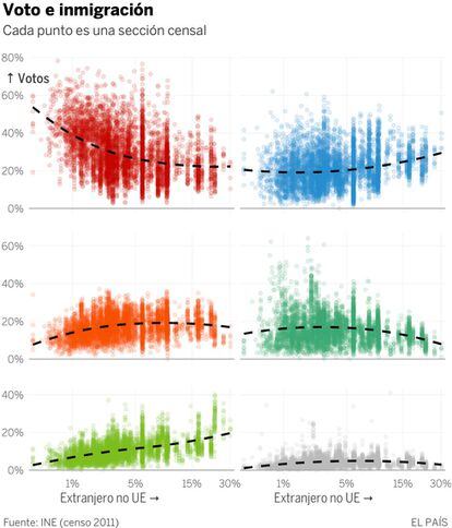 Hace unos días mostramos que Vox había crecido más en aquellos municipios con más inmigrantes de fuera de la Unión Europea (en su mayoría africanos y sudamericanos). El siguiente gráfico muestra los mismos datos para cada partido.