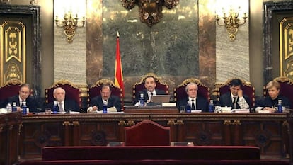 Más de un año después de que el Tribunal Supremo asumiera la causa abierta por rebelión contra los líderes independentistas de Cataluña, los abogados de los 18 acusados siguen sosteniendo que la investigación no correspondía al alto tribunal sino al Tribunal Superior de Justicia de Cataluña. El Supremo se ha pronunciado ya sobre este asunto en varias ocasiones y siempre lo ha hecho para ratificar que la competencia es suya: lo que lo previsible es que vuelva a insistir en su tesis tras la vista de ayer. El Constitucional tiene también pendiente resolver sobre ello, pero cuando lo haga, probablemente, el juicio ya habrá empezado y hasta puede haber terminado. Con esos antecedentes, los abogados de los acusados defendieron la postura contraria —que el juicio debe celebrarse en Cataluña— con convicción pero escasas expectativas. “Tengo poca confianza en que la sala acepte los argumentos de esta defensa. Tengo la sensación de que ya se ha tomado una decisión”, afirmó Jordi Pina, abogado de los exconsejeros Jordi Turull, Josep Rull y el expresidente de la ANC y actual diputado de Junts per Catalunya Jordi Sànchez.