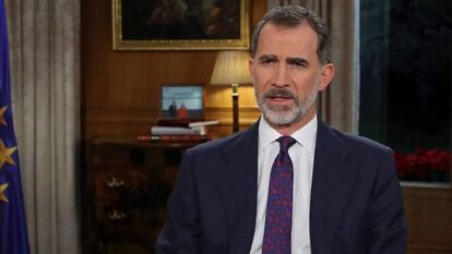El Rey se ha dirigdo en la noche de este lunes a los españoles con motivo de la Nochebuena. Su intervención ante las cámaras de televisión ha llegado en un momento de alta tensión política en España y con Cataluña como telón de fondo. Ha sido el primer mensaje navideño de Felipe VI con un Gobierno socialista —Pedro Sánchez llegó a la Moncloa el pasado junio— y el último que pronuncia en el marco del 40 aniversario de la Constitución, los dos componentes que han condicionado su contenido, junto al tono conciliador habitual de los discursos navideños del Rey.