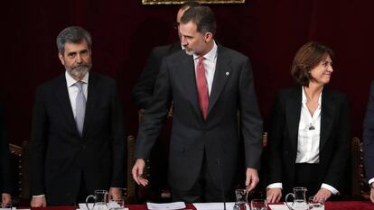 "El respeto a las resoluciones dictadas por los órganos judiciales son condiciones indispensables en cualquier democracia que se precie de serlo", ha subrayado este martes Felipe VI, por ejemplo, durante el acto de entrega de los despachos. Una ceremonia que se trasladó a Madrid desde Barcelona —sede de la Escuela Judicial y donde se venía organizando desde hace dos décadas— y que ha levantado recelos en Cataluña. "Es un gran error", dijo la juez decana de Barcelona. El CGPJ enmarcó la decisión, en cambio, en el 40 aniversario de la Constitución.