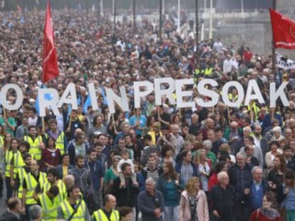 "Ahora los presos" decía el lema en euskera (Orain presoak) de la multitudinaria manifestación que ha reunido este sábado a decenas de miles de personas en el centro de Bilbao y en Bayona (Francia) en defensa del fin de la dispersión carcelaria de los reclusos de ETA y su acercamiento a las prisiones vascas. Los asistentes —76.000 según los organizadores, 70.000 según fuentes de la Policía Municipal— han dejado claro cuál es su causa principal: ahora toca resolver la situación penitenciaria de los 280 encarcelados de la banda, una vez que ya han transcurrido más de siete años desde que la organización terrorista puso fin a su actividad sangrieta, dos años desde que se deshizo de todo su arsenal de armas y explosivos y más de medio año desde que anunció su disolución.