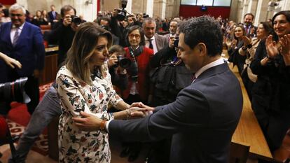 Juan Manuel Moreno Bonilla es el nuevo presidente de la Junta de Andalucía y el primero no socialista con 59 votos a favor, 50 en contra, gracias al apoyo de Ciudadanos y Vox. Sucede en el cargo a Susana Díaz, que por la tarde se ha dirigido en estos términos al nuevo mandatario: "Usted llega a la presidencia de la Junta con los herederos del franquismo".