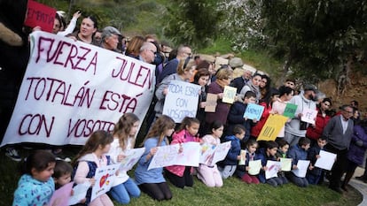 El Ayuntamiento de Totalán, un pueblo mínimo y blanco incrustado en la sierra, está en un callejoncito y su puerta se distingue de las demás casas porque encima del portal pone Casa Consistorial y de la fachada cuelgan cuatro banderas. En ese bloque modesto, idéntico a los del resto del pueblo, manda Miguel Ángel Escaño desde 2007. Su despacho está decorado con un retrato del Rey, un cuadro del paisaje de Totalán y, en las paredes, los carteles electorales del PSOE en todas elecciones municipales a las que se ha presentado. "¿Una concentración?", pregunta el alcalde mientras agita los brazos. Es martes. Se acaba de enterar, por redes sociales, de que en Totalán habrá una concentración de apoyo a la familia de Julen. Calibra posibilidades de asistencia para saber si tiene que cortar alguna carretera.